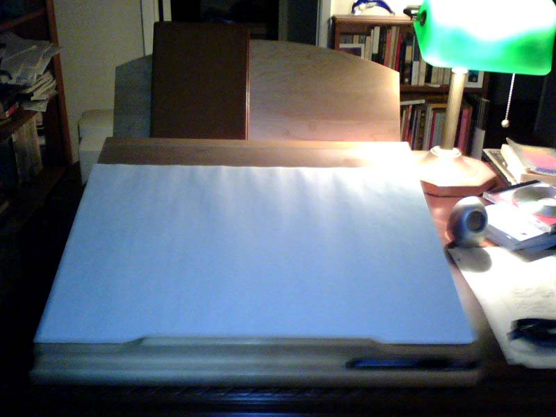 It’s 16″ x 11″ and filled with absolutely nothing. It’s supposed to contain my ideas for the direction of a chapter I’m working on, in which my protagonist confronts the question of his faith in God and explores his mysticism. [Sigh] That’s OK, it’ll come. Probably in the morning. Many scenes require coffee.