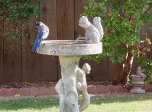 So the question is, how did I allow myself to be astonished today? Well, there was that moment in the afternoon, when I went through the back yard gate to water the flowers, and found the place was a playground for scrub jays. They were wildly happy, darting in circles around each other and around the birdbath with its fountain spouting from a concrete squirrel. It took them a moment to see me coming, and to hear the sound of the gate, and then they darted off.