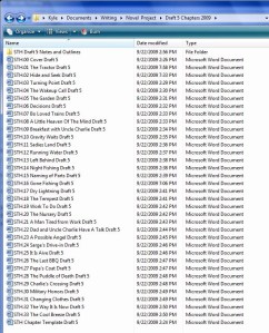 I’ve been working on my novel quite a bit. Over the past week, I’ve edited several chapters, organized most of my manuscript files, and some of my notes. I wrote a new outline too. Lots of work. Want to see what a novel looks like before it gets finished, when the files are just sitting in the computer? Sure you do.