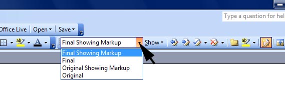 Today I learned that on the Reviewing Toolbar, there’s an option to select how you want to view the document. You can see the Final Showing Markups, the Final, the Original Showing Markups, or the Original. That’s a lot faster, and easier.