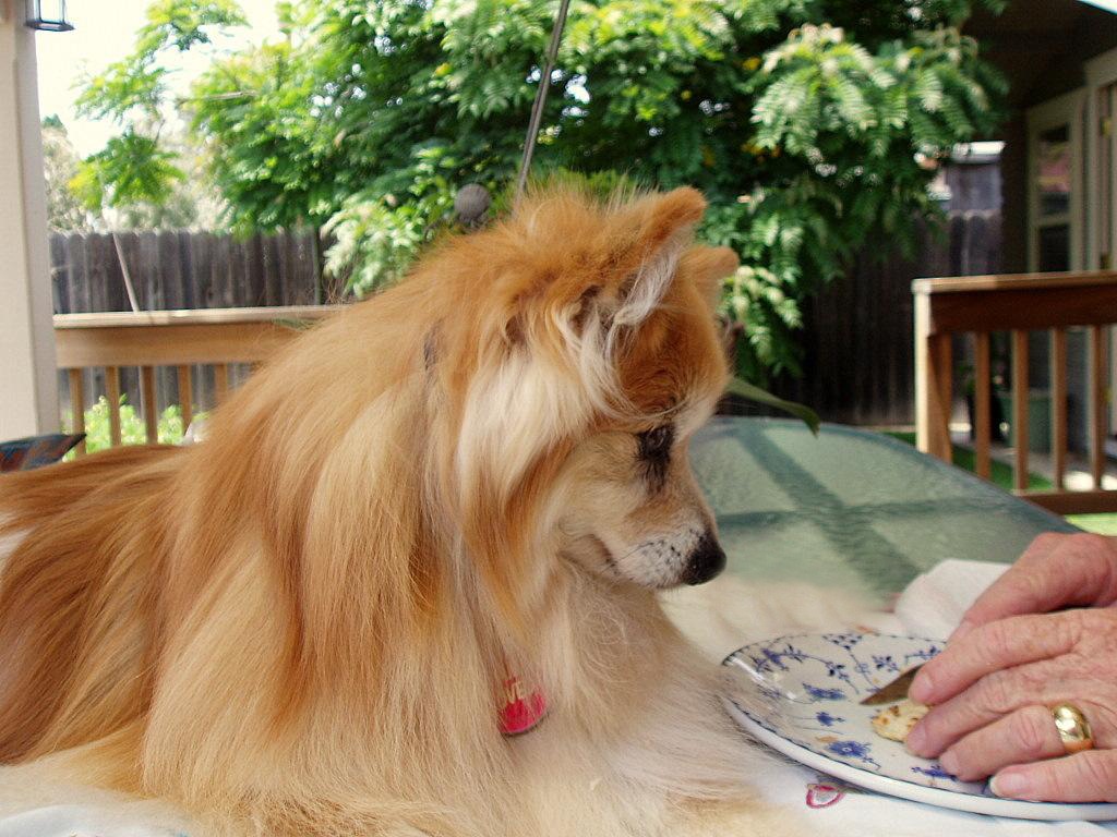 In this photo, Happy is having lunch just a few hours before the vet came to help her cross the bridge. I think lunch was her favorite, “oven baked” chicken from Subway.* She doesn’t look sick; she looks hungry and profoundly sweet and patient. But she was a pretty sick little doggie.
