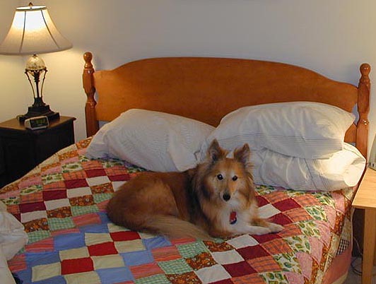 My sheltie Tasha was a poet though. Here’s a poem for memory, written by Tasha in 1999. For the record, I didn’t mind Tasha sleeping on the bed or the quilt. I think she made that up for artistic effect. This photo is of Tasha on the bed, about a year after she wrote the poem, when we moved to our new house.