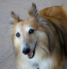 Tasha loved to go to town with me and my Dad when we’d get coffee. She’d sit and watch the people, and bark at other dogs. One of our favorite places was a bench in front of my bank and insurance agent’s office. This was taken there on 8.14.03.